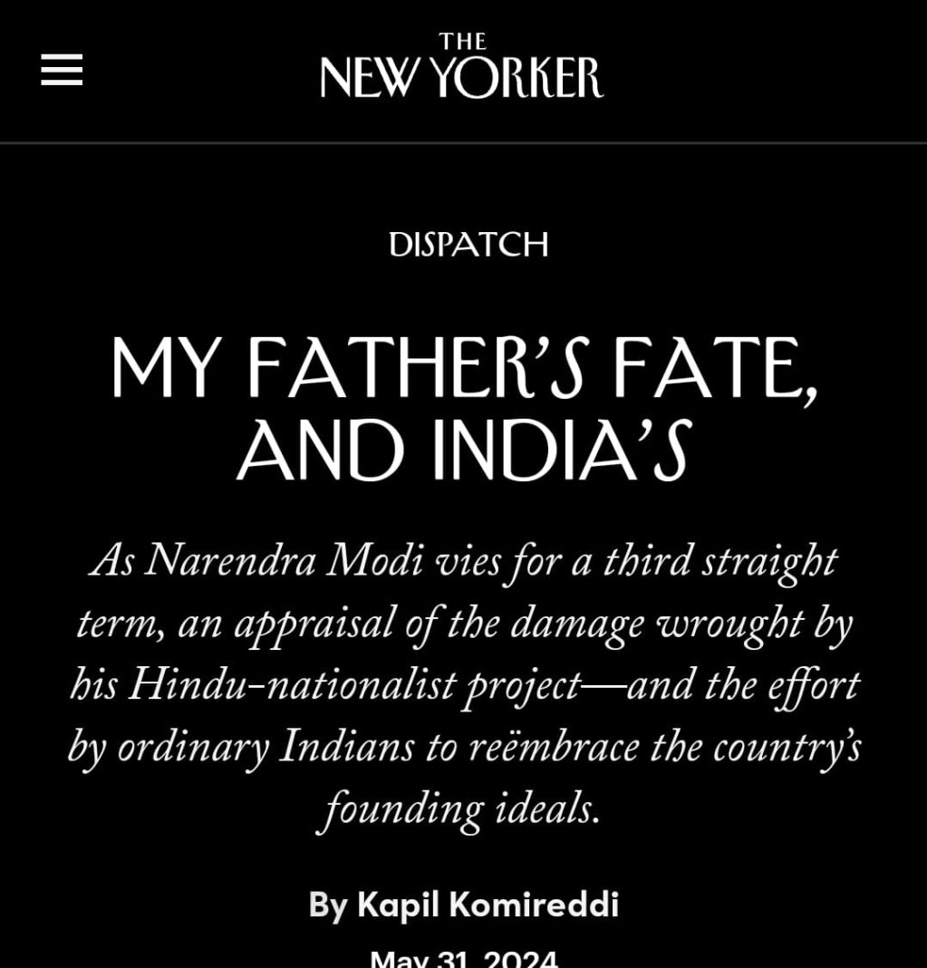 Kapil Komireddi wrote a vicious article titled “My Father’s Fate and India’s”, which was published in The New Yorker on Friday (31st May).