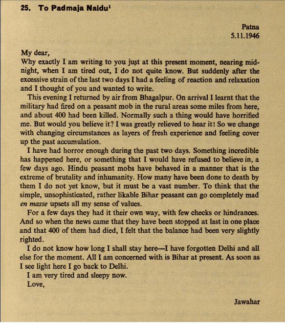This evening I returned by air from Bhagalpur. On arrival I learnt that the military had fired on a peasant mob in the rural areas some miles from here, and about 400 had been killed. Normally such a thing would have horrified me. But would you believe it? I was greatly relieved to hear it! So we change with changing circumstances as layers of fresh experience and feeling cover up the past accumulation.